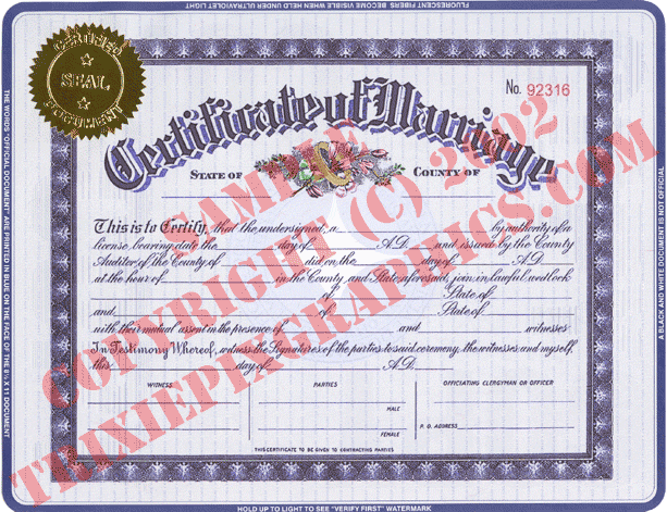 Our fake marriage certificates are offered for ENTERTAINMENT PURPOSES ONLY and are so stamped. We can’t control what you do with them when you receive them, and we’re not liable for your actions. If we sell you a pretty polished rock, and you go out and throw it through someone’s window, we’re not liable for that, either. These certificates are designed for couples who were disappointed (even appalled) at the poor quality of the certificates issued to them by the state. We just wanted to offer something nicer. Or weirder. Or fun-ner. This particular certificate may only be ordered BLANK.