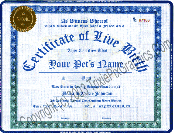 If you bought your pet from a pet store you probably got a receipt, or maybe a crappy, fake-looking “birth certificate” that was designed by some store employee as a novelty gag to placate us more serious pet owners. We’ve always found them tacky, bordering on insulting. You may not even know your pet’s birth date, but you can signify one day to symbolize it (just like we do with Christmas). Our pets are important to us; more so than we’re prepared to admit. A Birth Certificate is the best way to remind you when your pet’s birthday is coming up, and that you should do something special. Your pet won’t have a clue it’s its birthday (probably not, anyway), but it will know that you’re doing something special for it, and shouldn’t you do something special more often? A pet Birth Certificate helps you celebrate the life of a good pet, and helps you remember it as a special creature, when it’s gone. Please also see “Pet Memorial Certificates”
